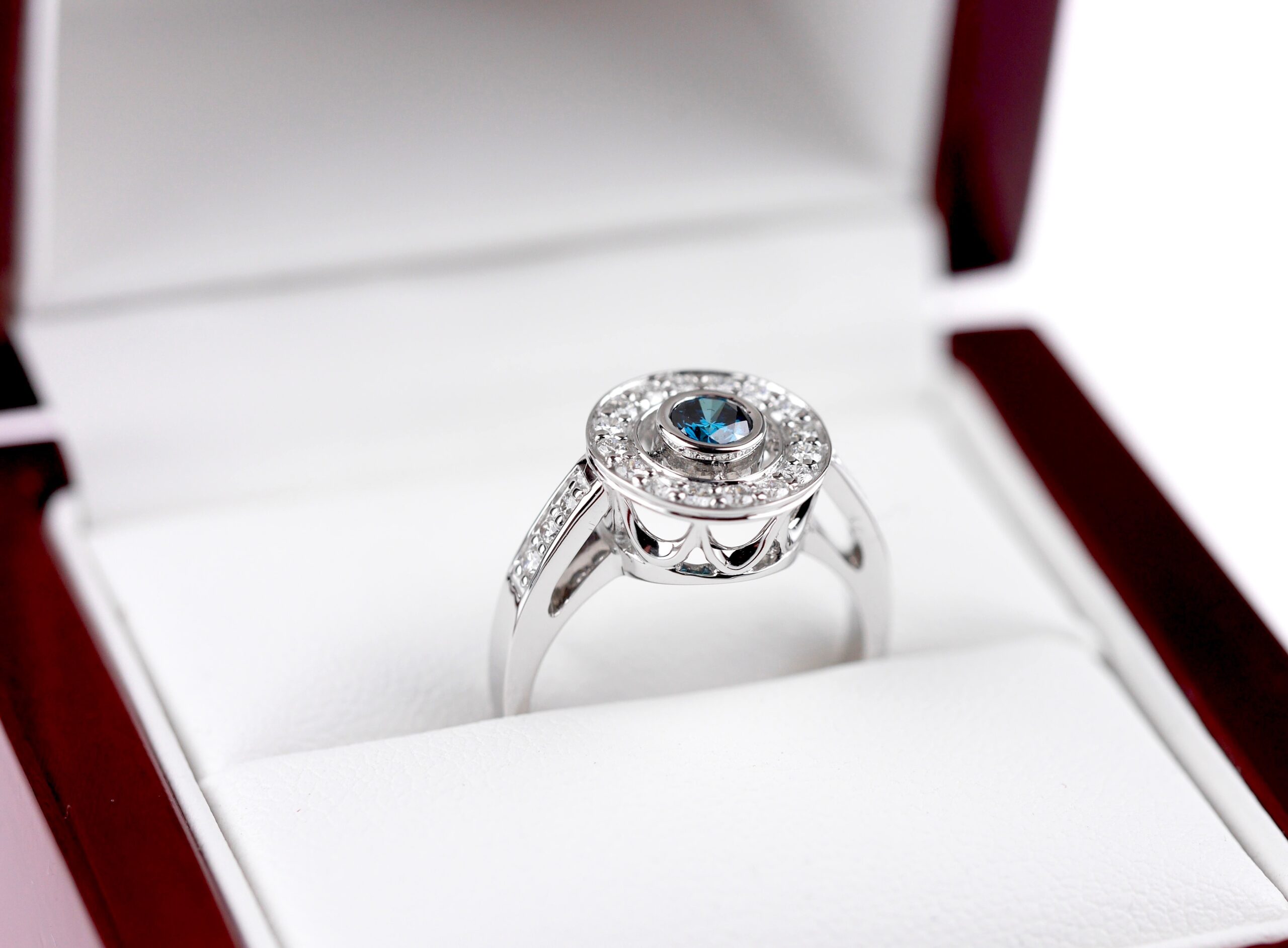 Pierścionek z białego złota z diamentami oraz niebieskim diamentem osadzonym centralnie.